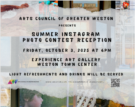 The top 25 photographs including all winning entries will be exhibited at the Weston Branch Library from September 1st – September 30th. You can also view the top 25 entries on the Arts Council’s Instagram (@1WestonFL) and Flickr (acgwfl) social media sites. There will be a reception to honor the photo artists.